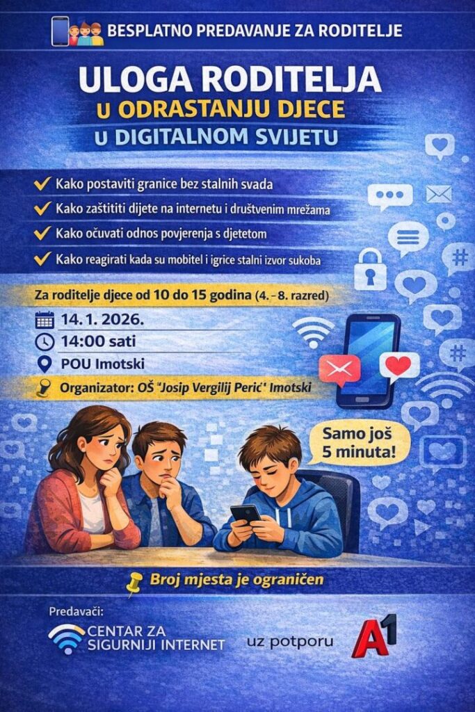 Predavanje je namijenjeno roditeljima djece u dobi od 10 do 15 godina (4. – 8. razred) te će se održati 14. siječnja 2026. godine u dvorani Pučkog otvorenog učilišta Imotski, s početkom u 14:00 sati.